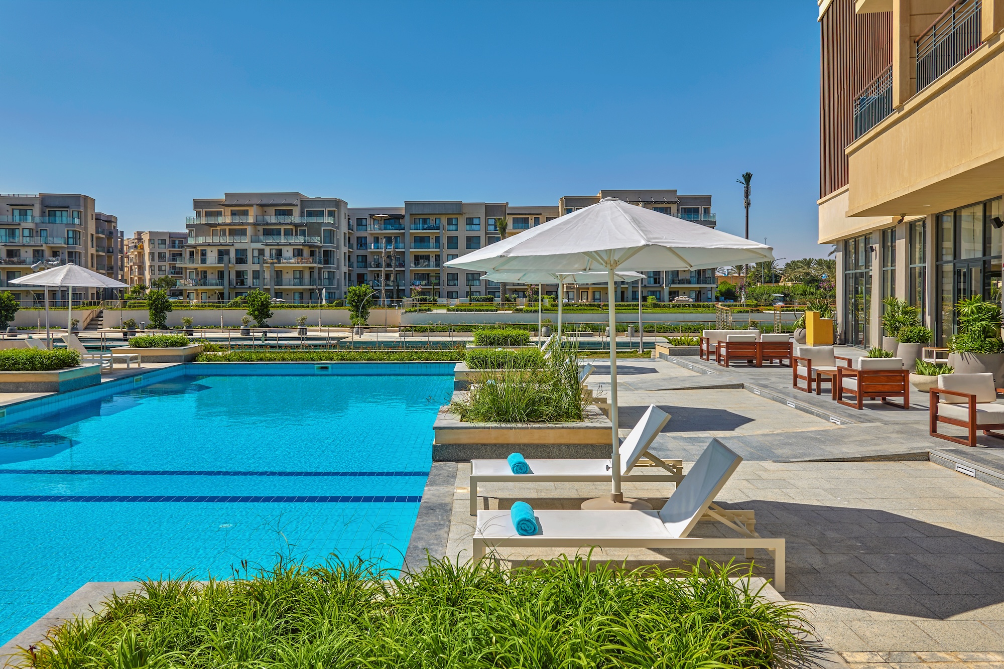 At Blanca Hotel, the lagoon is a peaceful spot to relax by calm waters. It’s the perfect place to unwind, enjoy the quiet, and take in the beautiful views of Marassi.